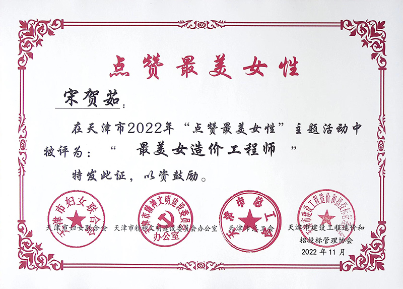 在“三八”國際勞動(dòng)?jì)D女節(jié)到來之際,從天津市泛亞工程咨詢有限公司傳來喜訊:在市婦聯(lián)、市文明辦、市總工會(huì)、津價(jià)招協(xié)聯(lián)合開展的天津市2022年“點(diǎn)贊最美女性”主題活動(dòng)中,泛亞公司造價(jià)三部部門經(jīng)理宋賀茹榮獲“最美女造價(jià)工程師”稱號。