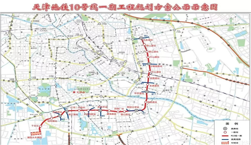 天津地鐵10號(hào)線為城區(qū)西南至東北方向的軌道交通骨干線,南起西青區(qū)梨園頭,最終進(jìn)入北部新城地區(qū),全長(zhǎng)43.2公里。地鐵10號(hào)線南段工程由梨園頭至嶼東城,從衛(wèi)國(guó)道途經(jīng)沙柳路、天鋼柳林、珠江道、麗江道、梅江至梨園頭車輛段,線路全長(zhǎng)約21公里,其中地下線20.3公里,過(guò)渡線及地面線0.7公里,共設(shè)21座車站(20個(gè)地下站,1個(gè)地面站),設(shè)梨園頭車輛段,與地鐵1、2、4、5、6號(hào)線換乘。