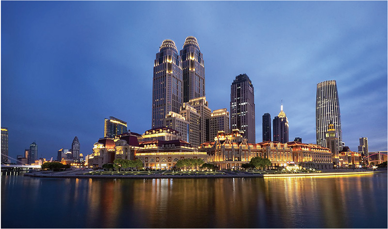 津灣廣場位于天津市和平區(qū)的一處海河河灣南岸,為緊鄰海河、面向天津站的歐式建筑群。建筑面積17.1萬平米,由5座歐式風格的地上商業(yè)建筑及地下商業(yè)街、停車場共同構成。其建筑風格與周邊原租界內的歷史建筑一致,為天津金融城的標志性區(qū)域。