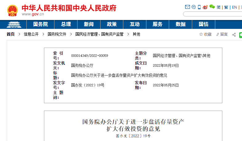 為深入貫徹習近平新時代中國特色社會主義思想,完整、準確、全面貫徹新發展理念,加快構建新發展格局,推動高質量發展,經國務院同意,現就進一步盤活存量資產、擴大有效投資提出以下意見。